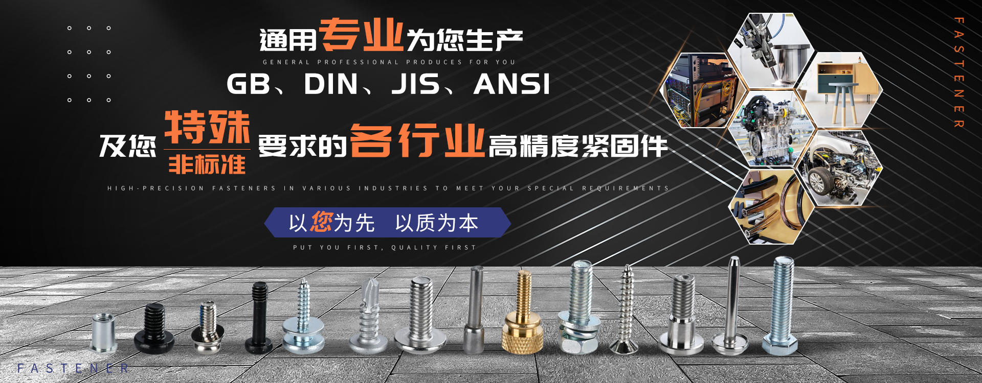 中山市通用螺絲制造有限公司成立于1987年,工廠坐落于廣東四小虎之一的中山市,北連廣州,毗鄰港澳。總占地面積14000m 2,足有兩個足球場。1998年通過德國萊茵TUV ISO9002認證,于2002年通過TUV ISO9001:2000認證。2008年通過ISO 14000認證。我司主營自攻螺絲、組合螺絲機械螺絲防松螺絲等標準和非標準件,既可按客戶的要求提交所需的產品,也可為客戶量身定做所需產品。我司擁有專業的產品檢測隊伍和投影分析儀、金相、硬度計(韋氏和洛氏)、扭矩力測試計等完善的檢測設備,為電子、電器、五金塑料、衛浴、家具、機械、汽配等行業提供符合歐盟質量、環保要求的產品2006年,我司自主開發的ERP管理系統,使我們的生產和服務效率得到了極大的提高。 經過三十多年地摸爬滾打,依靠眾多新老顧客的支持,通用螺絲逐漸成長為國內知名的緊固件供應商。了解更多 >>